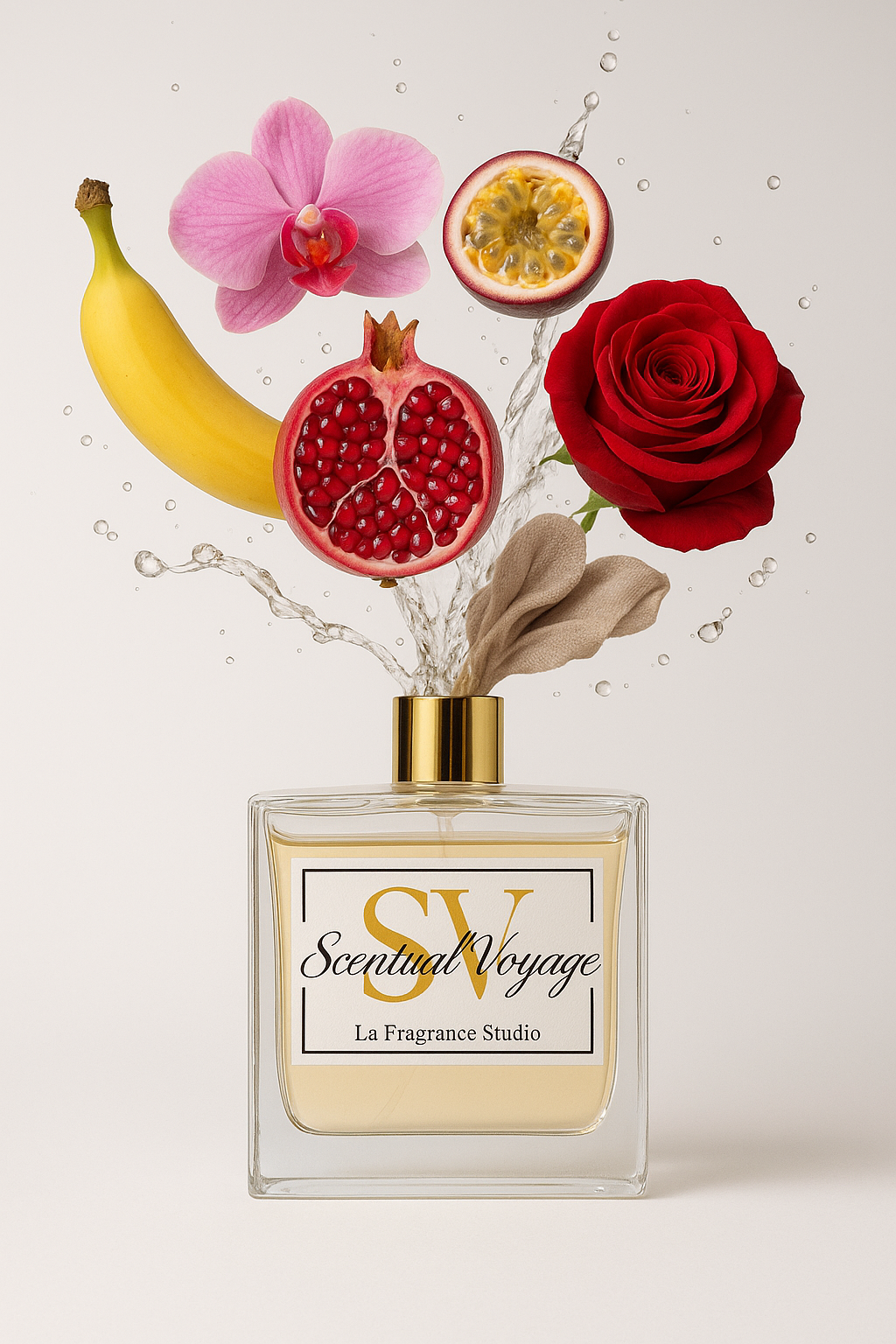 Description: A breezy tropical escape with banana, exotic fruits, and soft cashmere meets a garden of roses and orchids nestled amongst sweet pomegranate.
